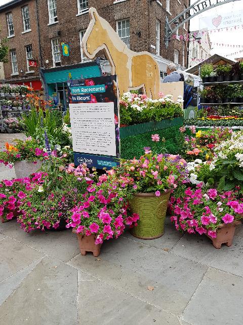 Photo of the Bloom display above and flowers at York Racecourse below: